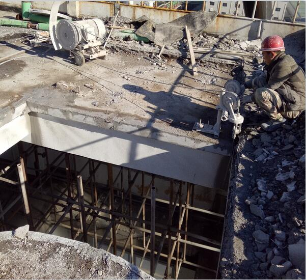 靜力切割是金剛石工具在高速運轉下對鋼筋混凝土進行磨削,產生的粉屑靠冷卻水帶走,終形成切割面,所以不存在振動問題,對原保留結構無沖擊,不會產生微裂紋破壞,不影響結構受力和使用壽命,這是其它類型的拆除方法無法做到的,因此此工法更適合于有保留結構的混凝土的拆除施工。